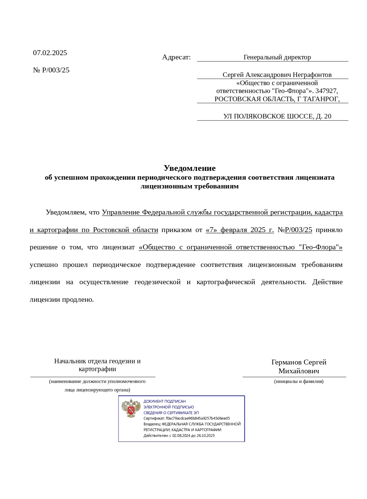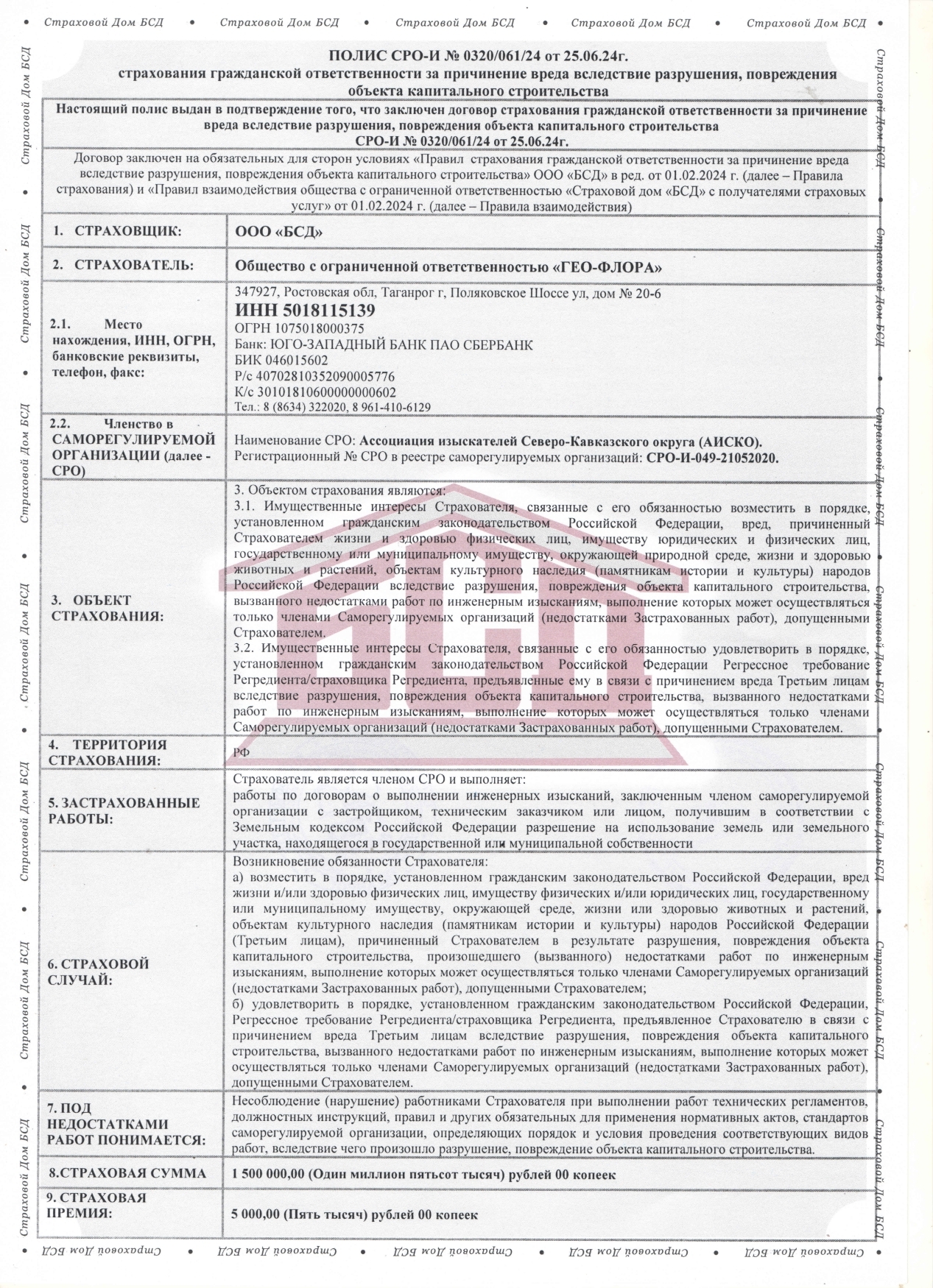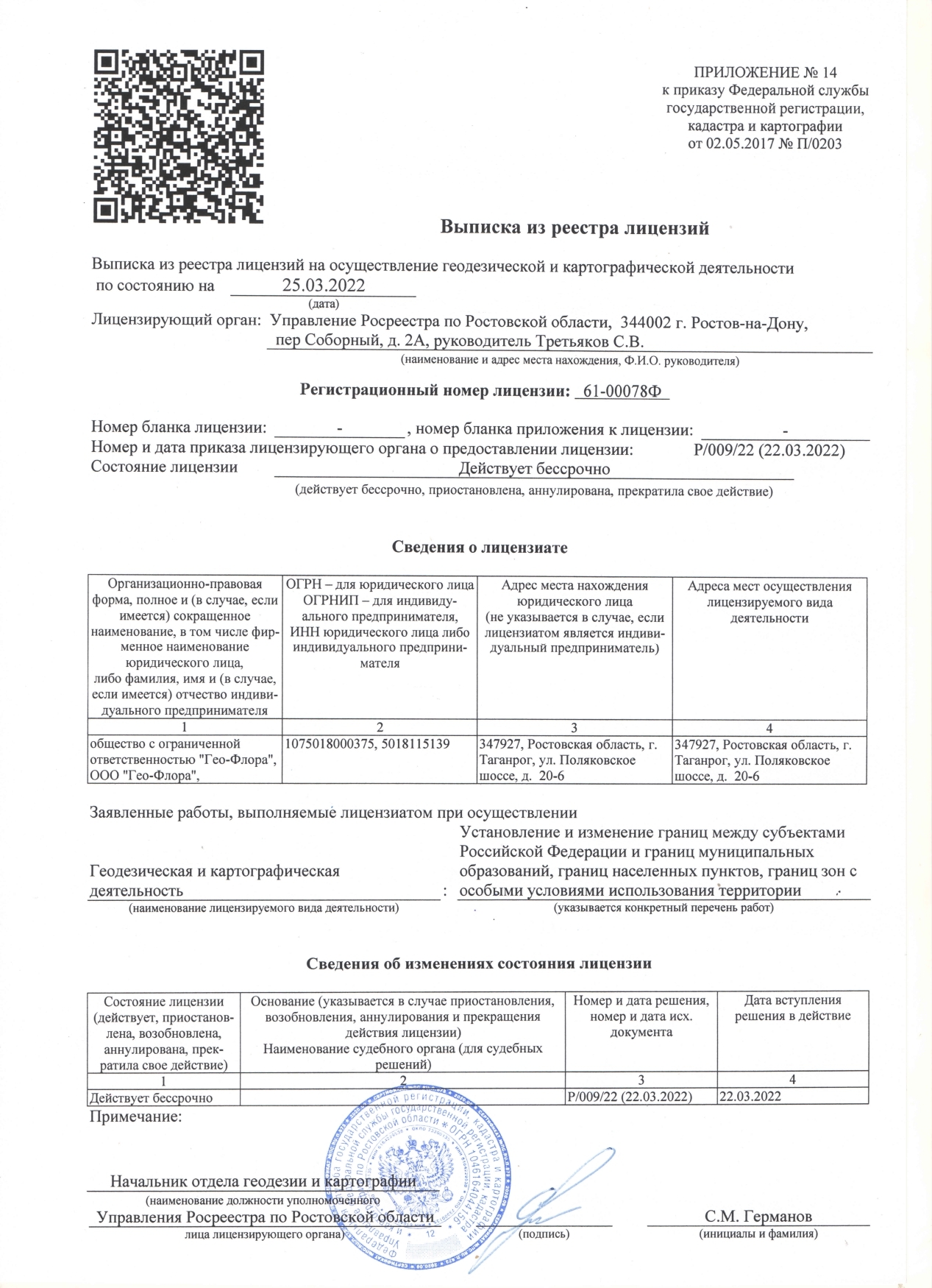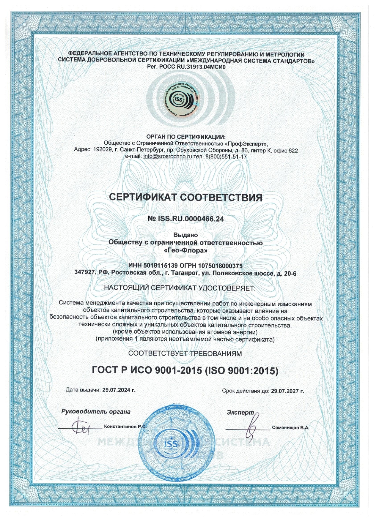 ООО «Гео-Флора» обладает всеми необходимыми лицензиями, допусками, свидетельствами и разрешениями, необходимыми для успешного выполнения работ для наших заказчиков.